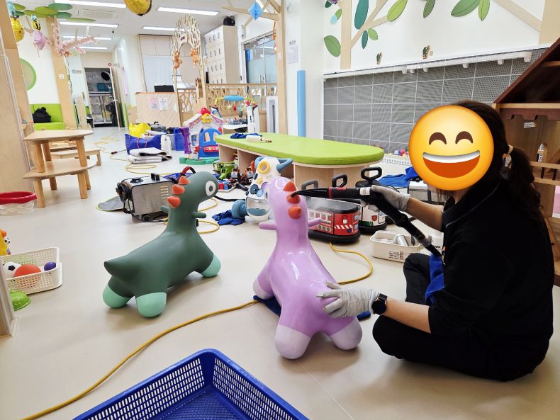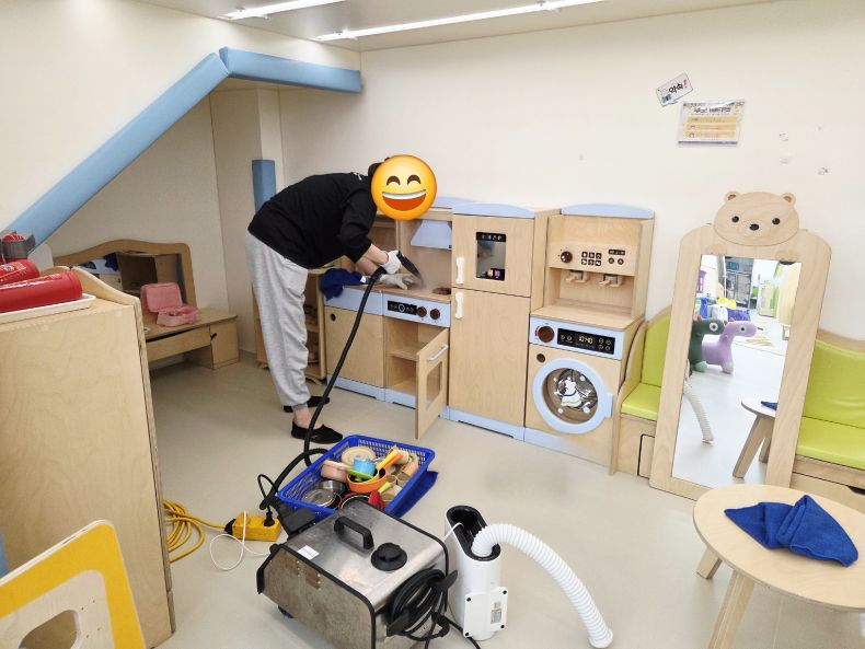 장난감과 시설물을 스팀세척살균소독 하였습니다.